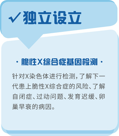 目前这个检测针对孕妇及其伴侣的X染色体,暂未覆盖胎儿的X染色体。如欲检测胎儿的染色体,请参阅NTAD23无创胎儿产前检测。假你或你的伴侣有遗传病史,想为胎儿或检测特定的遗传疾病,请联系我们遗传咨询团队,为你提供专业的意见。