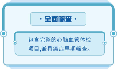 透过血液测试、超声波检查、心电图等,不同检测方法,评估血管的健康情况及患有常见都市病的机会。如高血压、高血脂、高血糖、糖尿病、脂肪肝、肝硬化等;亦可根据个人身体状况评估患有癌症肿瘤风险,如大肠癌早期筛检,有助及早检查预防心脑血管疾病及癌症风险。